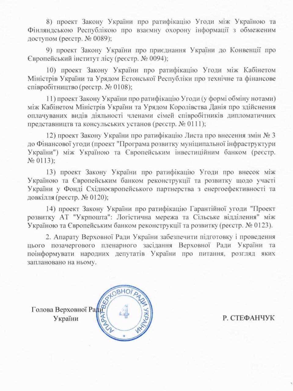- №0112 - ратификация Гарантийного соглашения "Логистическая сеть (Модернизация и цифровизация "Укрпочты")" между Украиной и Европейским инвестиционным банком;