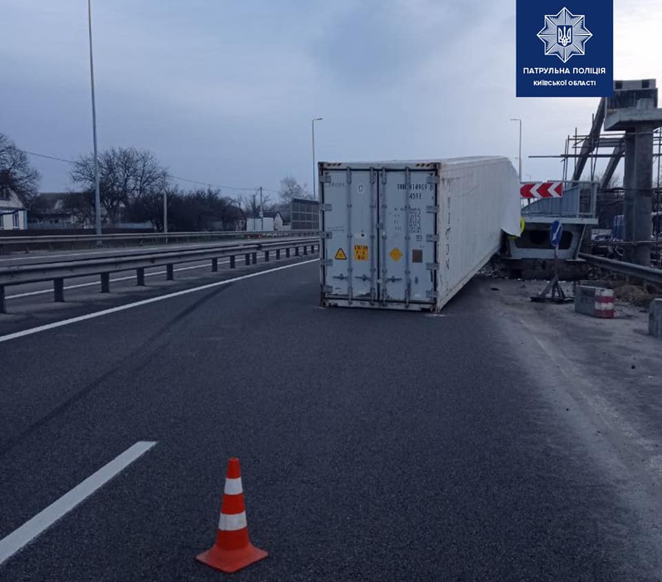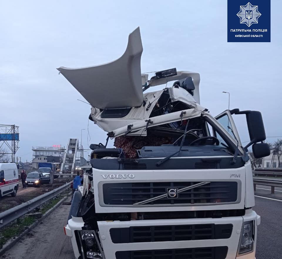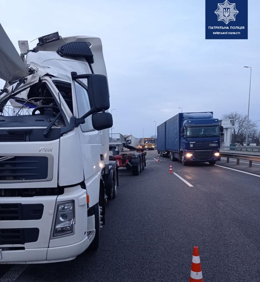 Как сообщает патрульная полиция Киевской области, в Васильковском районе (Киевская область) водитель грузовика Volvo въехал в металлическую секцию пешеходного моста.