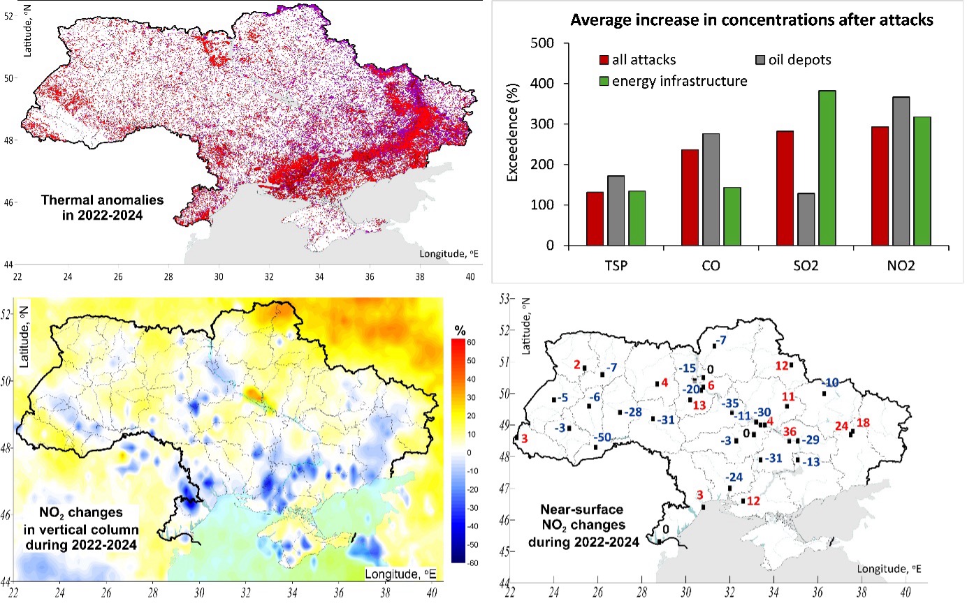 В крупных городах и промышленных центрах концентрации твердых частиц, диоксида азота (NO₂) и моноксида углерода (CO) в основном снижались. Вблизи линии фронта, напротив, росли. Концентрации диоксида серы (SO₂) увеличивались, что свидетельствует о переходе на более «грязные» виды топлива и изменении структуры энергопотребления.
