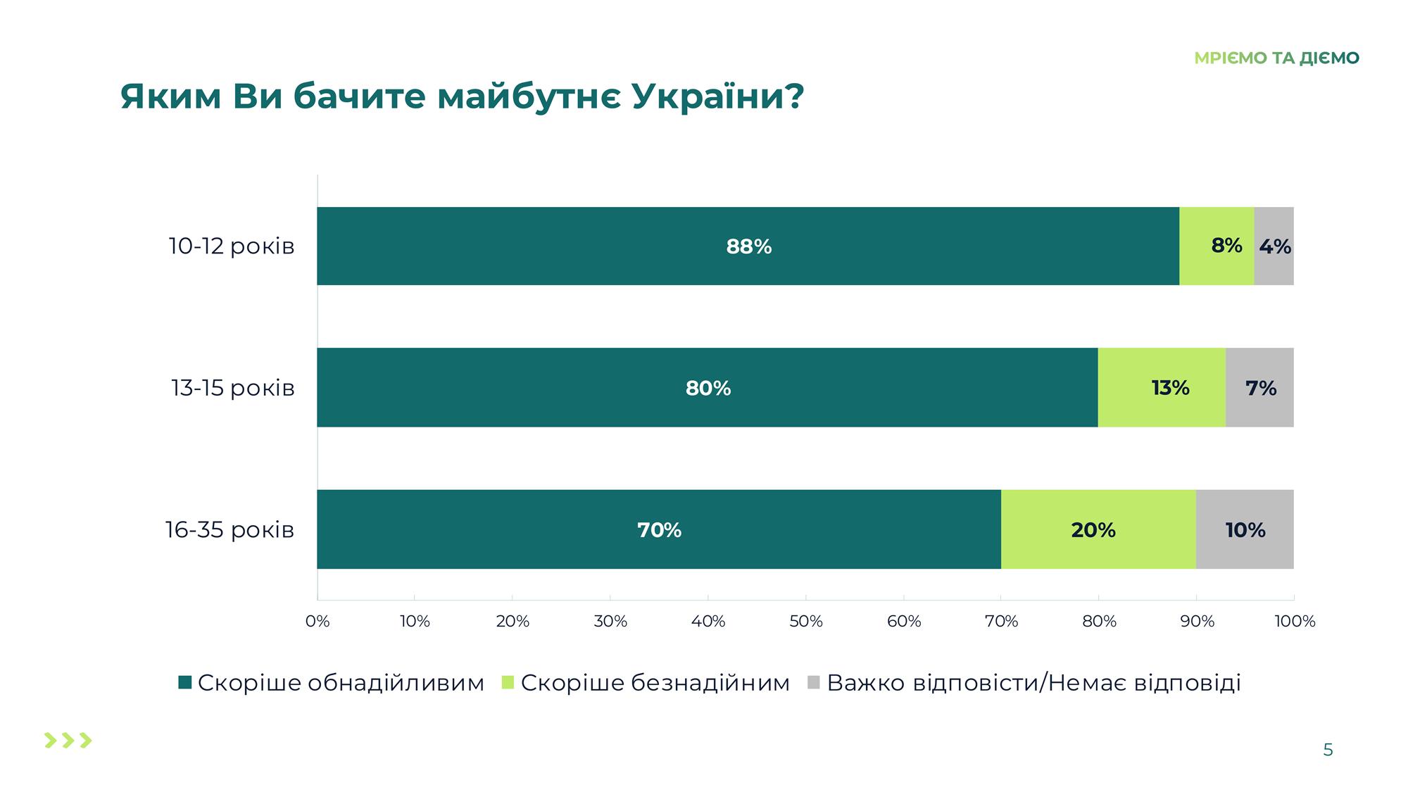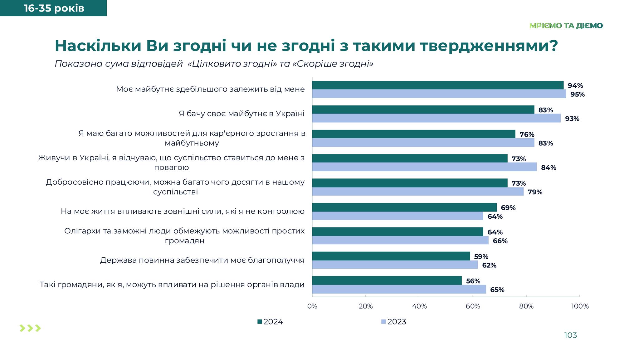 В 2024 году 83% молодых украинцев от 16 до 35 лет видят свое будущее в Украине. При этом 94% верят, что их будущее во многом зависит от их собственных усилий.