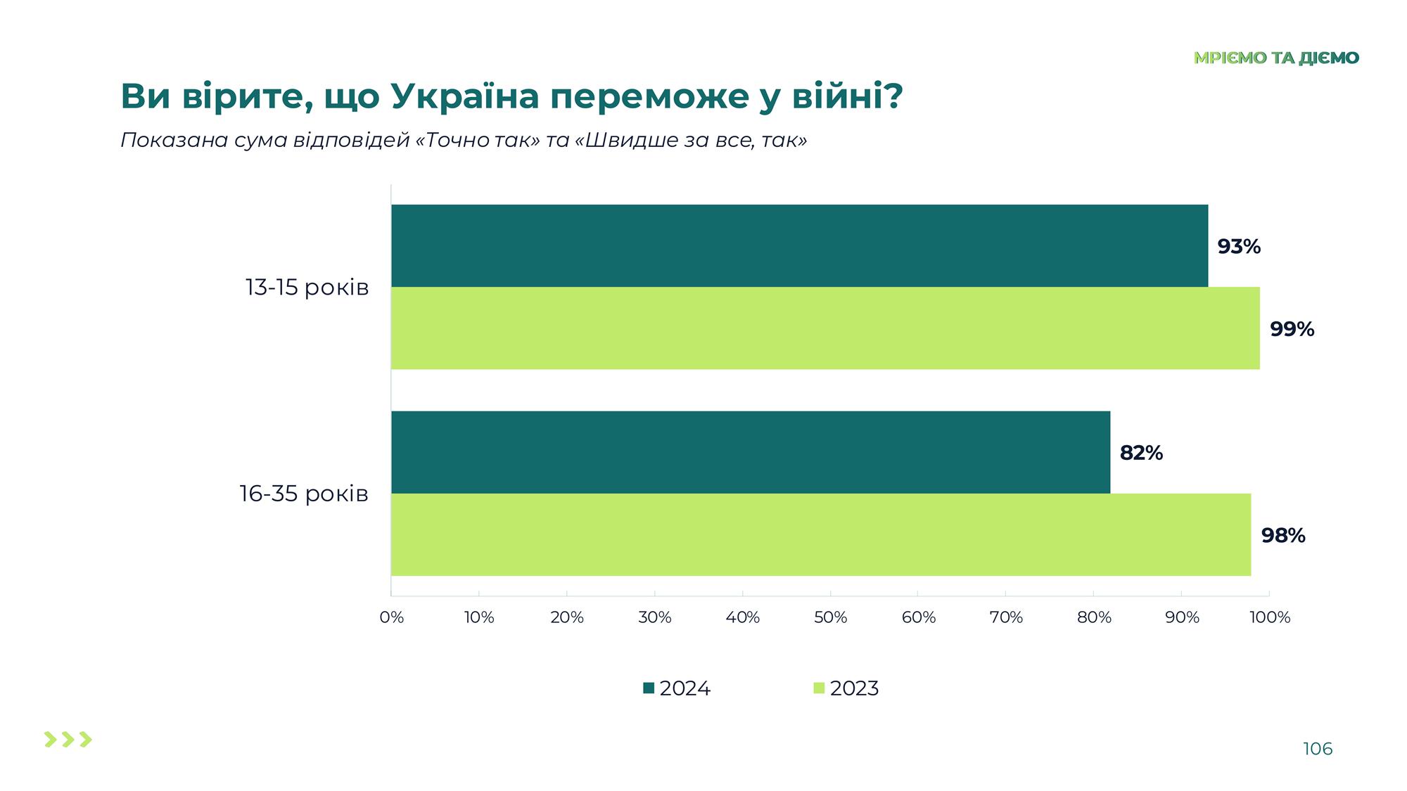 Вера в победу в войне также снизилась: если в 2023 году 98% молодых людей были уверены в победе, то в этом году эта цифра составляет 82%.