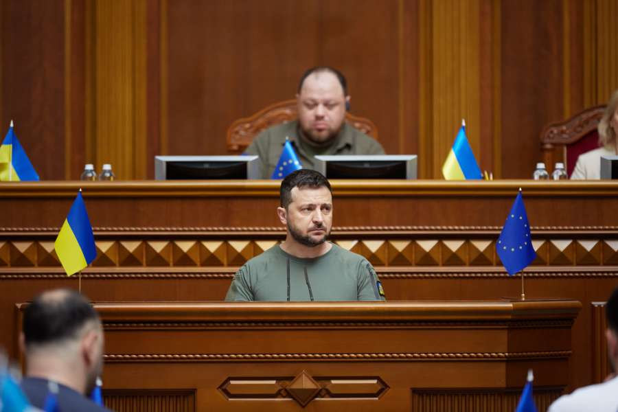 Президент Владимир Зеленский, председатель Верховной Рады Руслан Стефанчук и премьер-министр Денис Шмыгаль подписали совместное заявление о полноценном членстве Украины в ЕС.