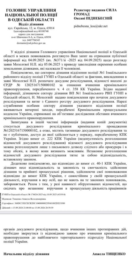 Отметим, что редакция СИЛЫ ОБЩЕСТВ со своей стороны обратилась в полицию Одесской области с вопросом о килийских правоохранителях, которые закрывают глаза на преступления, совершенные с участием "местных элит". На днях мы получили ответ.
